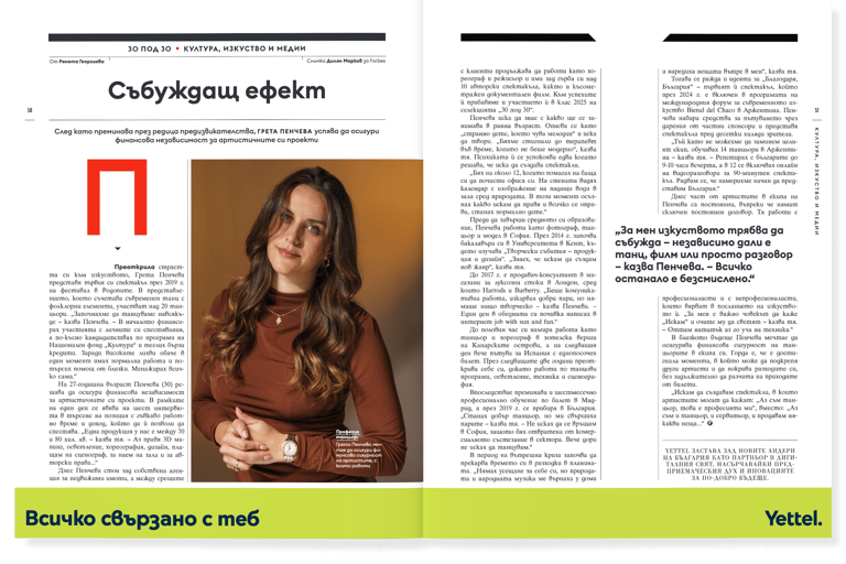 Тя е част от селекцията Forbes 30 Under 30 България в категория „Изкуство и култура“ – признание за нейния принос, визия и предприемачески подход в култарната индустрия. Комбинацията между артистична визия и бизнес мислене създава различен подход към недвижимите имоти – с внимание към детайла, стратегическа перспектива и дългосрочна стойност.